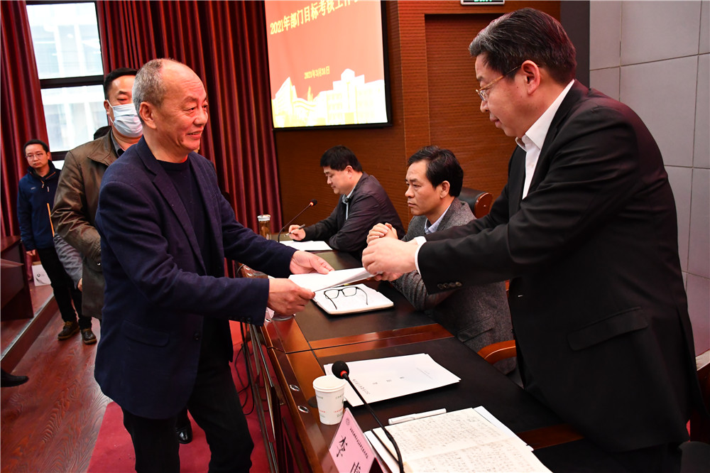 会上,各部门主要负责人向学校主要领导递交2021年度目标考核责任书。教务处、机电工程学院负责人交流发言。