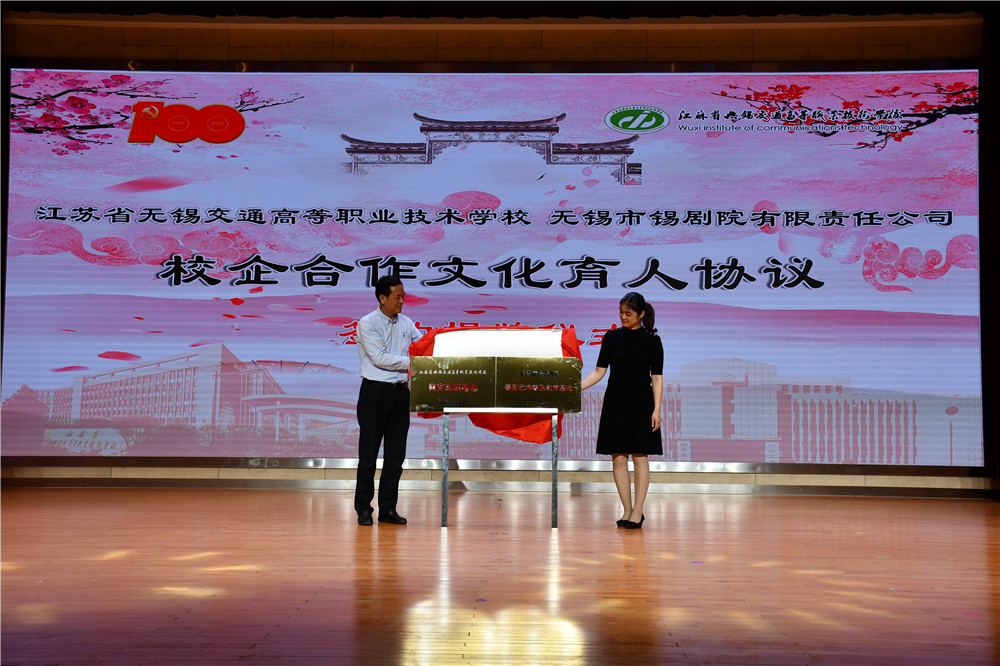 开幕式上,耿兴华副校长和无锡市锡剧院徐俊副院长签订学校与无锡市锡剧院开展“锡剧文化进校园”校企合作协议并揭牌。为学校增挂“锡剧艺术普及教育基地” 同时为戏剧院增挂“美育实践基地”。此举通过打造地方戏剧文化学习宣传普及基地,弘扬锡剧艺术,传承优秀地方文化,进一步加强学校美育工作。