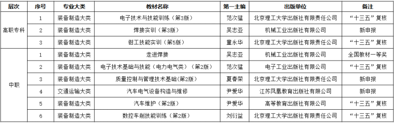近日,教育部公示拟入选首批“十四五”职业教育国家规划教材名单,学校教师主编的9部教材入选首批“十四五”职业教育国家规划教材。其中新申报教材入选3部教材,“十三五”复核教材入选6部教材,具体入选名单见下表: