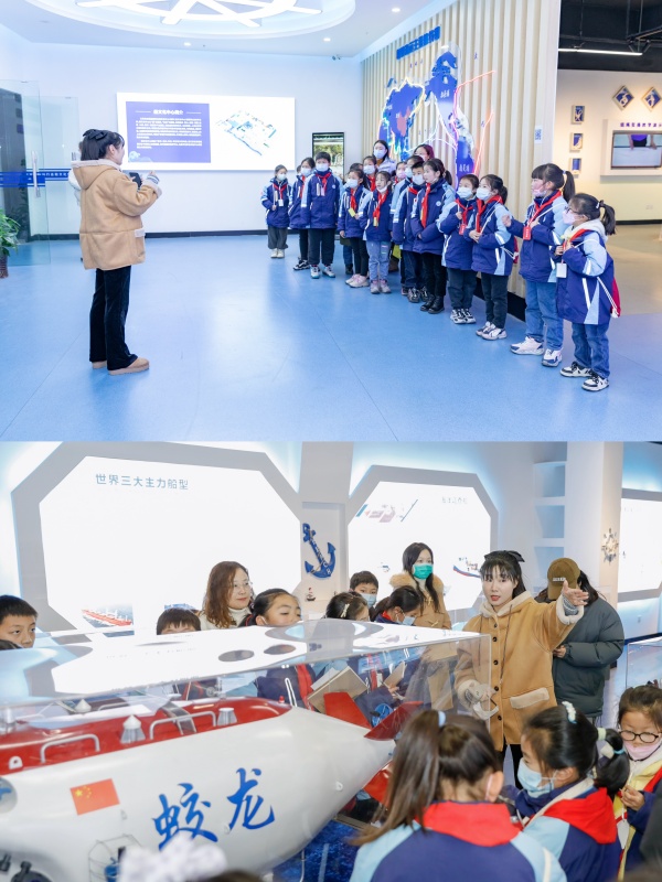 船舶工程学院院长吴志亚和讲解老师带领志愿者和小学生参观了整个船文化中心,并进行了生动有趣的讲解和体验。小学生们被各类船舶模型、航海模拟器、VR和全息等设备吸引,纷纷排队体验。通过参观、交流和体验,小学生们对船文化及航海有了更进一步的认识和了解。此次活动让小学生们认知船舶专业,感受船文化,激发民族自豪感和爱国主义热情,拓展了学习视野,增强海洋意识,培养热爱科学、大胆实践和勇于创新的精神。