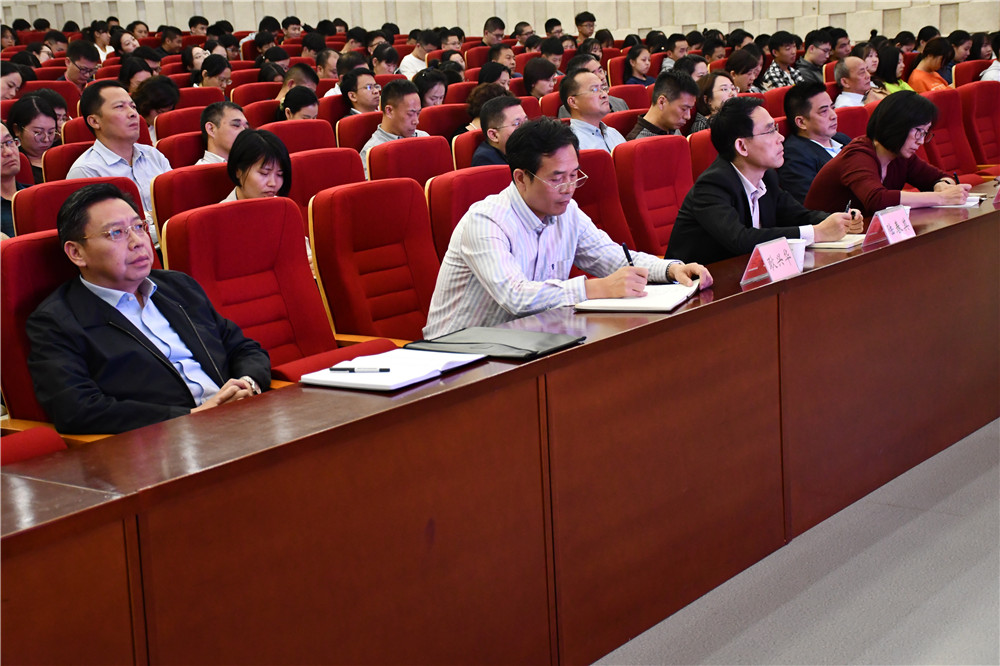 根据学?!安煌跣摹⒗渭鞘姑敝魈饨逃凳┓桨傅囊?,10月9日下午,学校召开“不忘初心、牢记使命”主题教育专家辅导报告会?;嵋樘匮肓酥泄步帐∥承6督淌?、国家社会科学基金重大项目首席专家王世谊同志,为大家作了《新中国70年:光辉历程、宝贵启示与现实思考》专题辅导。全体校领导、全体中层干部、全体党员、各学院班团干部参加了此次报告会。报告会由学校党委书记李虎主持。
