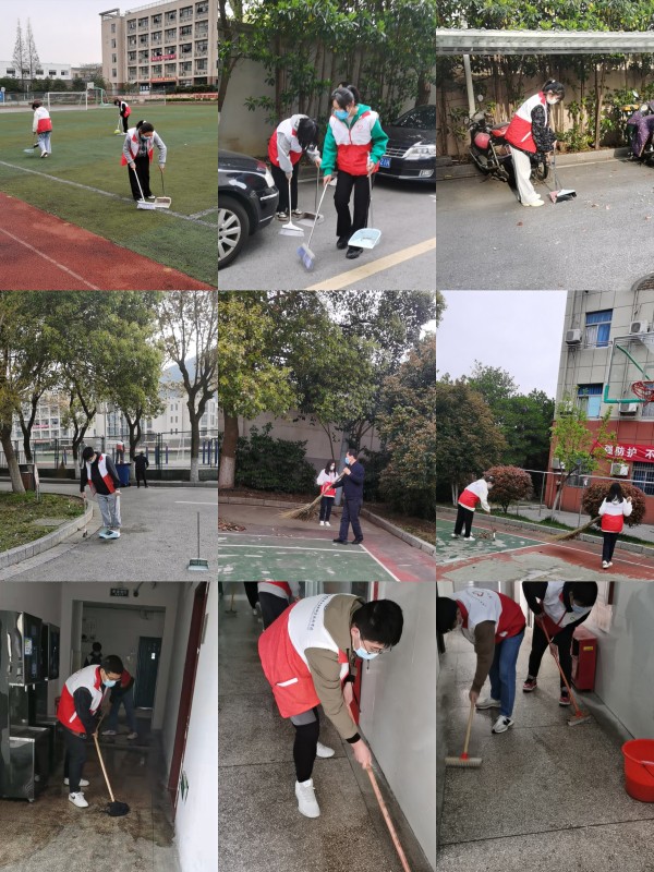 上午时分, 志愿者准备就绪, 陆续来到集合地点。他们均戴着口罩,在例行检测体温后,按照学校的相关安排,分散到各自负责的清洁区域,开始了行动,对全校作了一次彻底的、无死角的大清扫。