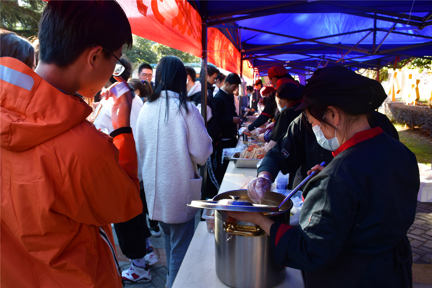 活动现场,人声鼎沸、锣鼓喧天。从限时供应的风味小吃、制作的特色美食,美食节期间的每一个角落都氤氲着烟火的温度。每个摊位前都排着长长的队伍,在场的师生门迫不及待的来现场享受这一场饕餮盛宴。