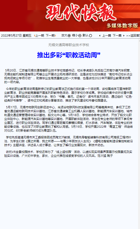 现代快报:江苏省无锡交通高等职业技术学校推出多彩“职教活动周”