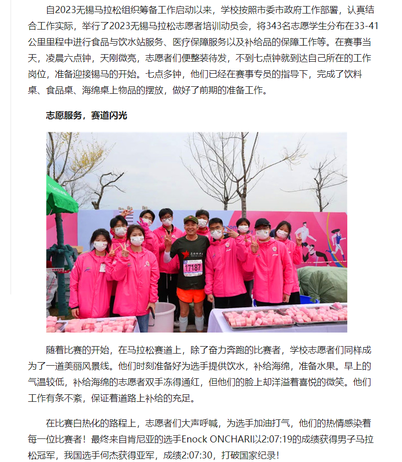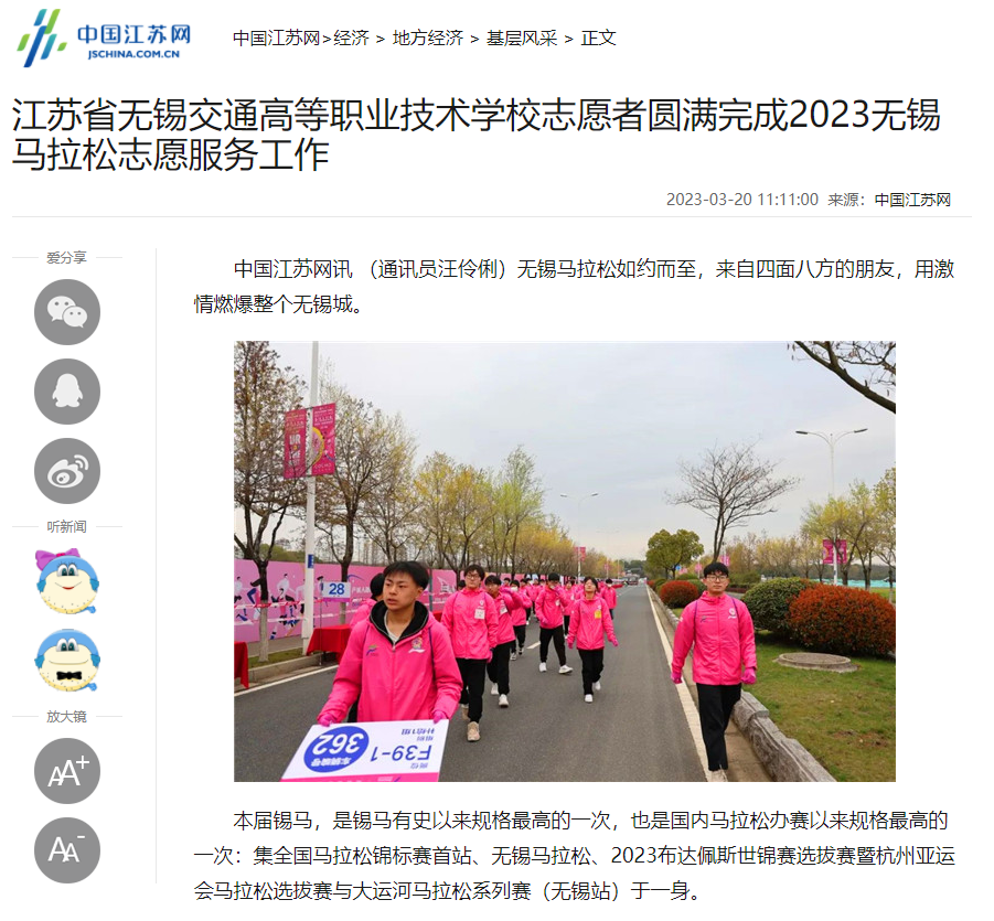 中国江苏网:江苏省无锡交通高等职业技术学校志愿者圆满完成2023无锡马拉松志愿服务工作