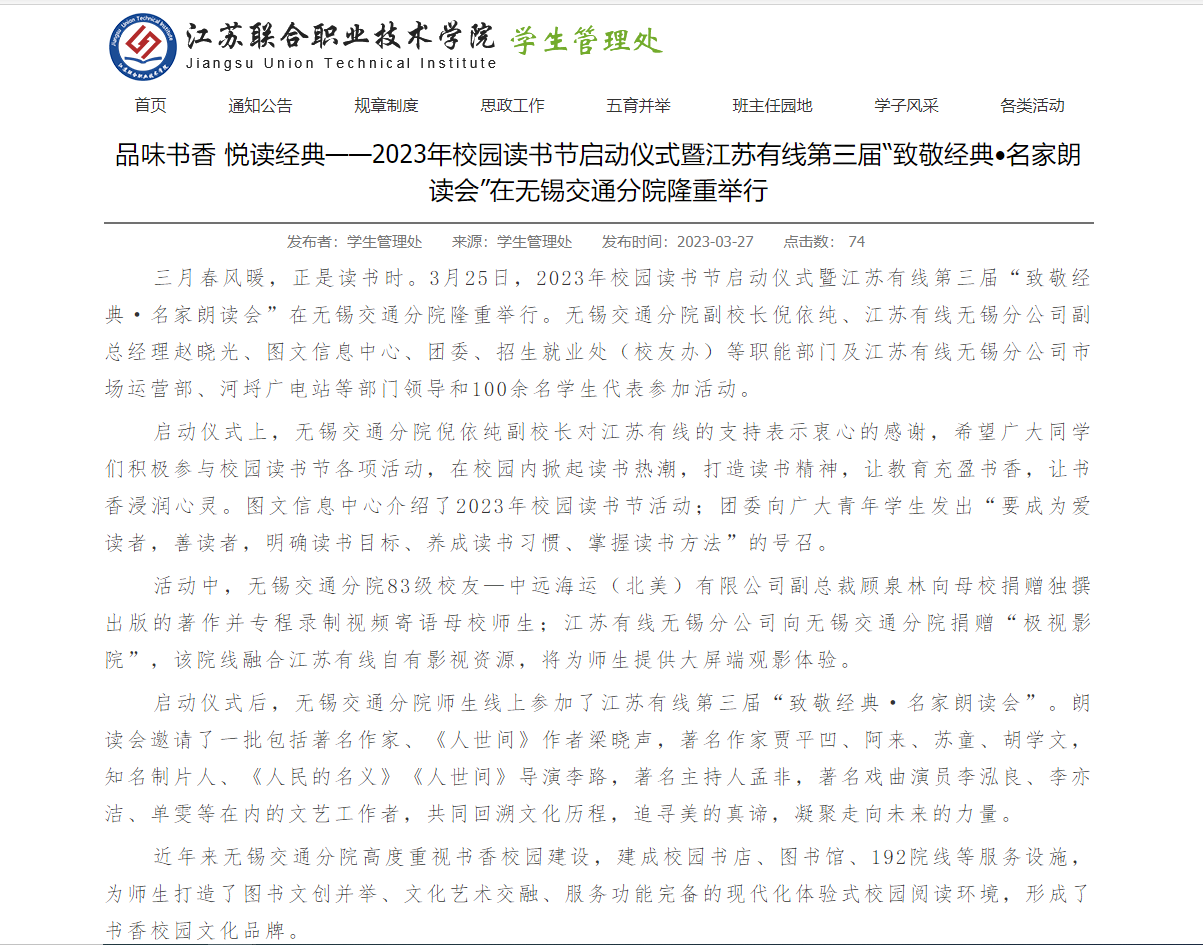 江苏联合职业技术学院官网:2023年校园读书节启动仪式暨江苏有线第三届“致敬经典?名家朗读会”在无锡交通分院隆重举行
