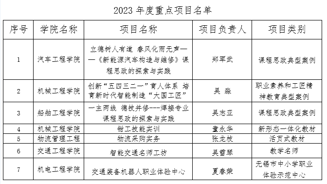 近日,无锡市教育局公布了无锡市职业教育质量提升攀登计划2023年度重点项目,我校11个项目入?。?/span>智能交通名师工坊认定为无锡市职业教育名师工坊;《立德树人有道 春风化雨无声—<新能源汽车构造与维修>》课程思政的探索与实践》和《一主两线 德技并修—焊接专业课程思政的探索与实践》两个项目认定为课程思政典型案例;《创新“五四三二一”育人体系 培育新时代智能制造“大国工匠”》被认定为职业素养和工匠精神教育典型案例;沈力辉、姚柯、陶建华、金学恒等4名同学认定为技能雏鹰;《钳工技能实训》认定为新形态一体化教材;《物流采购实务》被认定为活页式教材;交通装备机器人职业体验中心被认定为无锡市中小学职业体验示范中心。