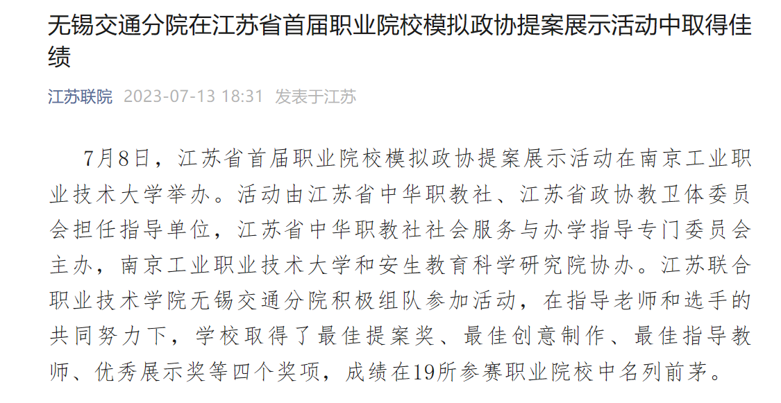 中江网:江苏省无锡交通高等职业技术学校在江苏省首届职业院校模拟政协提案展示活动中取得佳绩