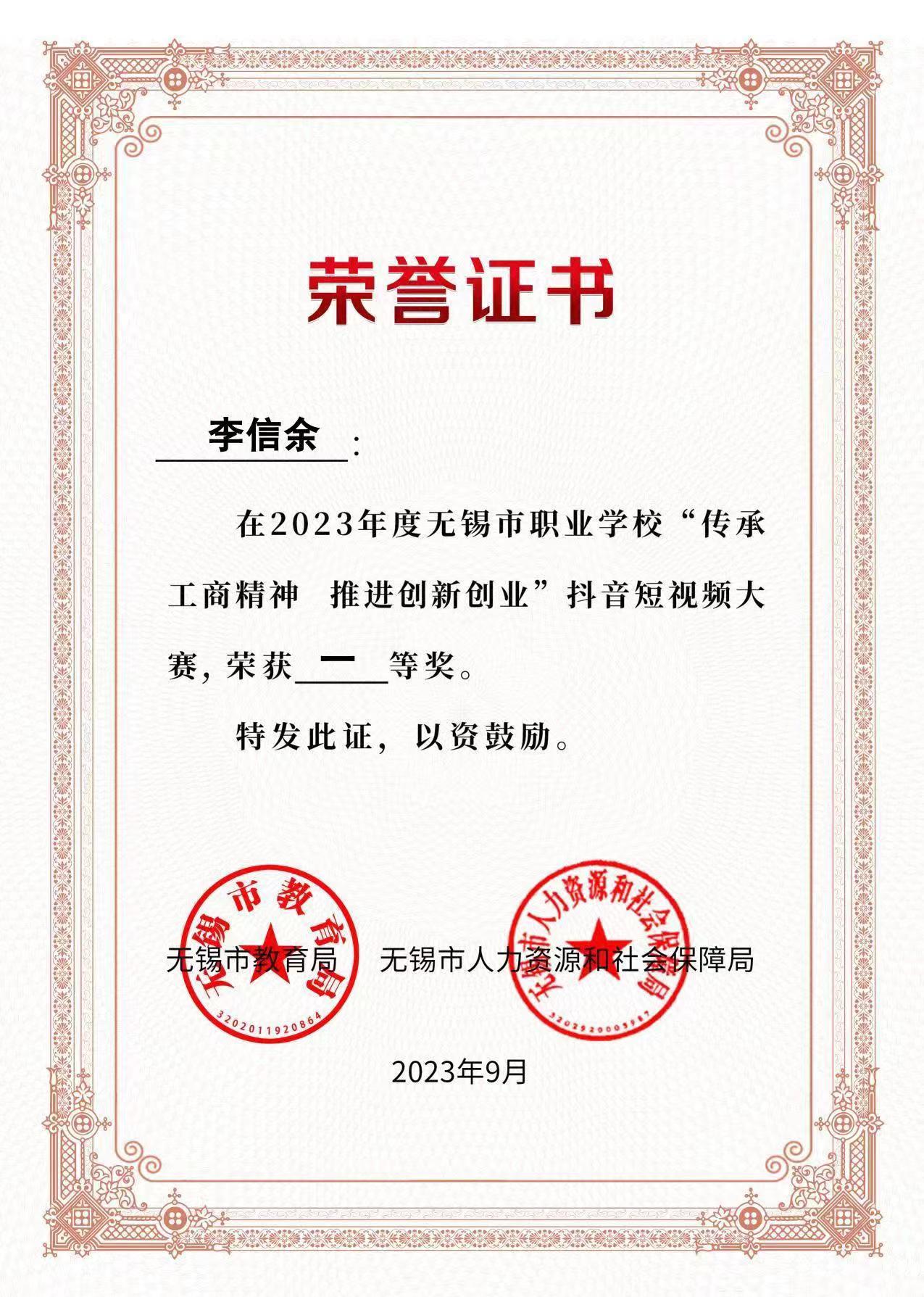 近日,在2023年度无锡市职业学校“传承工商精神 推进创新创业”抖音短视频大赛中,学?;绻こ萄г?21341班学生李信余提交的短视频作品《传承与弘扬无锡工商业精神》脱颖而出,荣获一等奖!