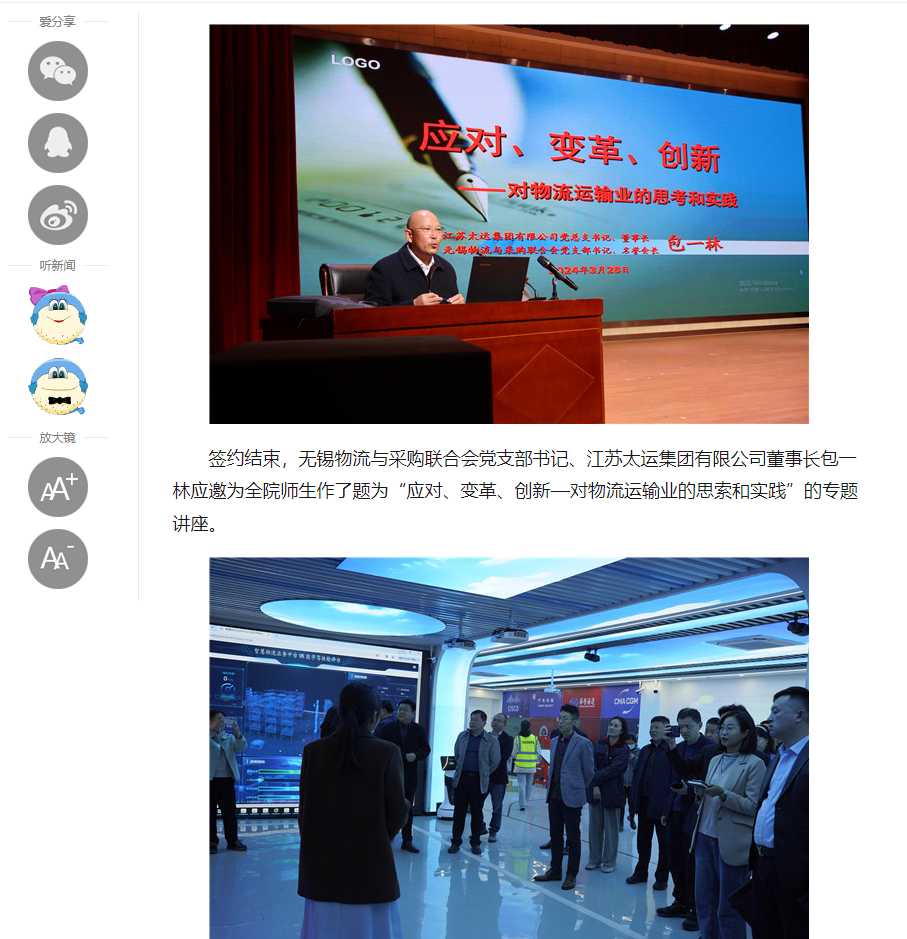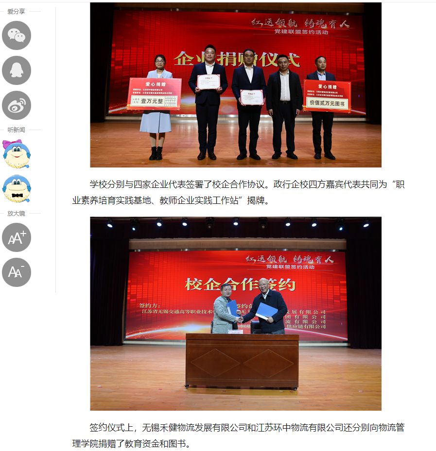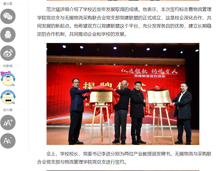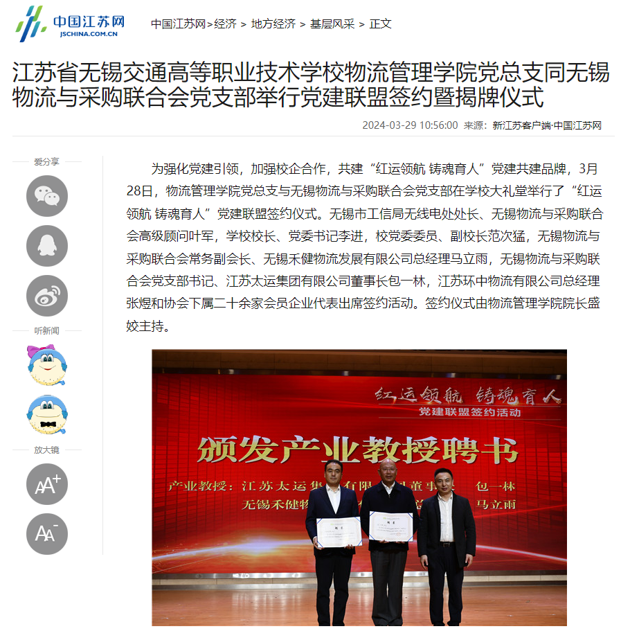 中江网:江苏省无锡交通高等职业技术学校物流管理学院党总支同无锡物流与采购联合会党支部举行党建联盟签约暨揭牌仪式