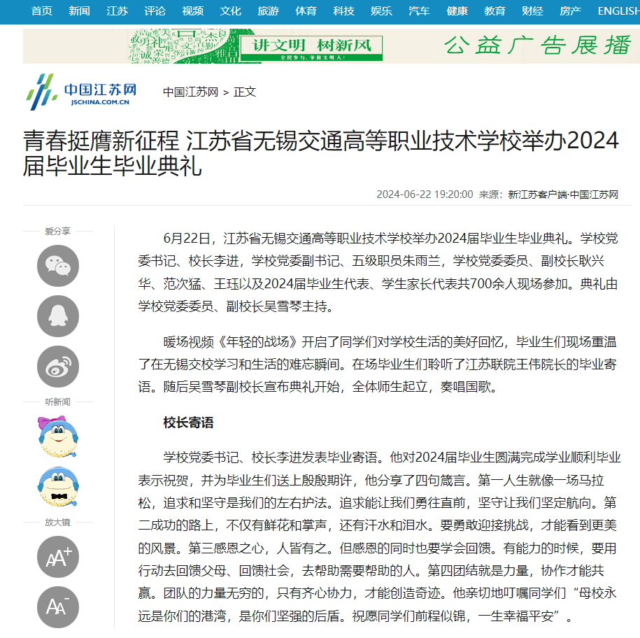 中江网:青春挺膺新征程 江苏省无锡交通高等职业技术学校举办2024届毕业生毕业典礼