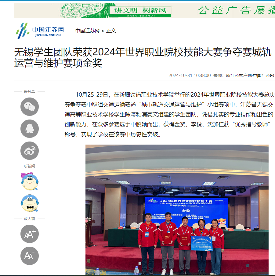 中江网:无锡学生团队荣获2024年世界职业院校技能大赛争夺赛城轨运营与维护赛项金奖