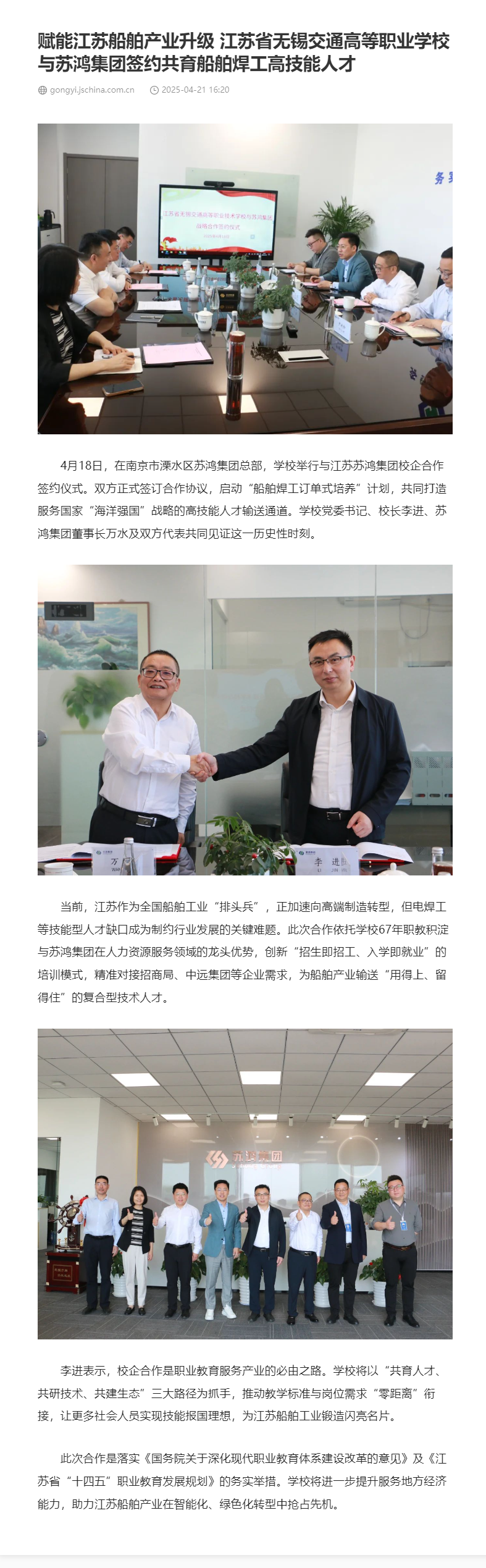 中江网:赋能江苏船舶产业升级? 江苏省无锡交通高等职业学校与苏鸿集团签约共育船舶焊工高技能人才?