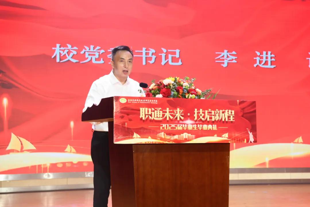 青春筑梦正当时,扬帆起航向未来。6月21日,学校2025届毕业生毕业典礼在励志楼大礼堂举行。典礼通过线上线下相结合的方式,共同见证2025届学子圆满完成学业、开启人生新篇章。学校党委书记李进,校长耿兴华,副校长范次猛以及2025届毕业生代表、教师代表、学生家长代表、校企合作企业代表共700余人现场参加,未能返校的毕业生及家长和亲友通过无锡博报正直播、学校官方视频号和抖音号直播方式同步参加。典礼由学校副校长王珏主持。