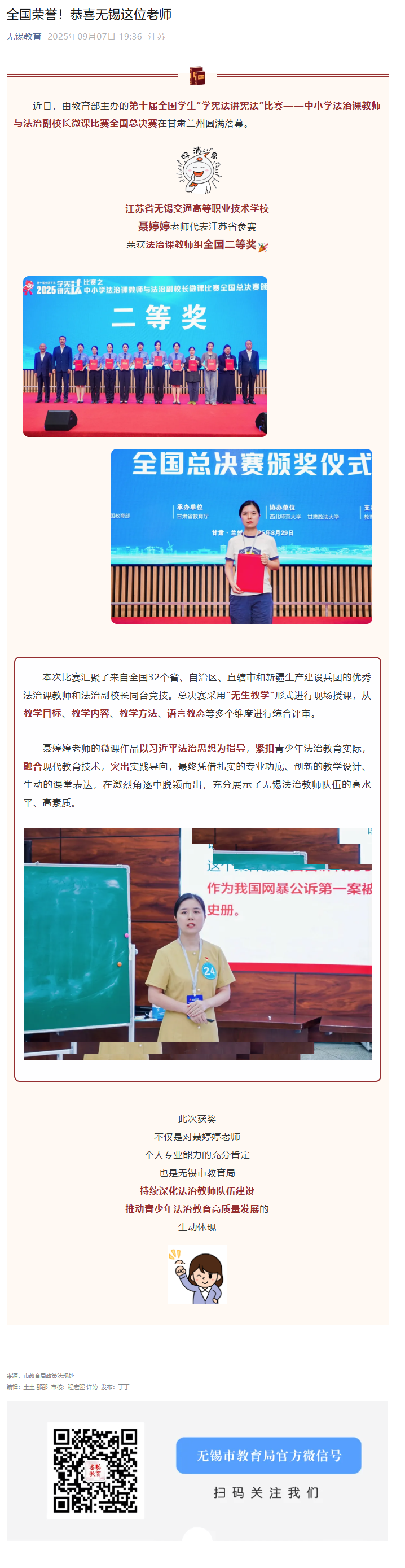 无锡教育:全国荣誉!恭喜无锡这位老师