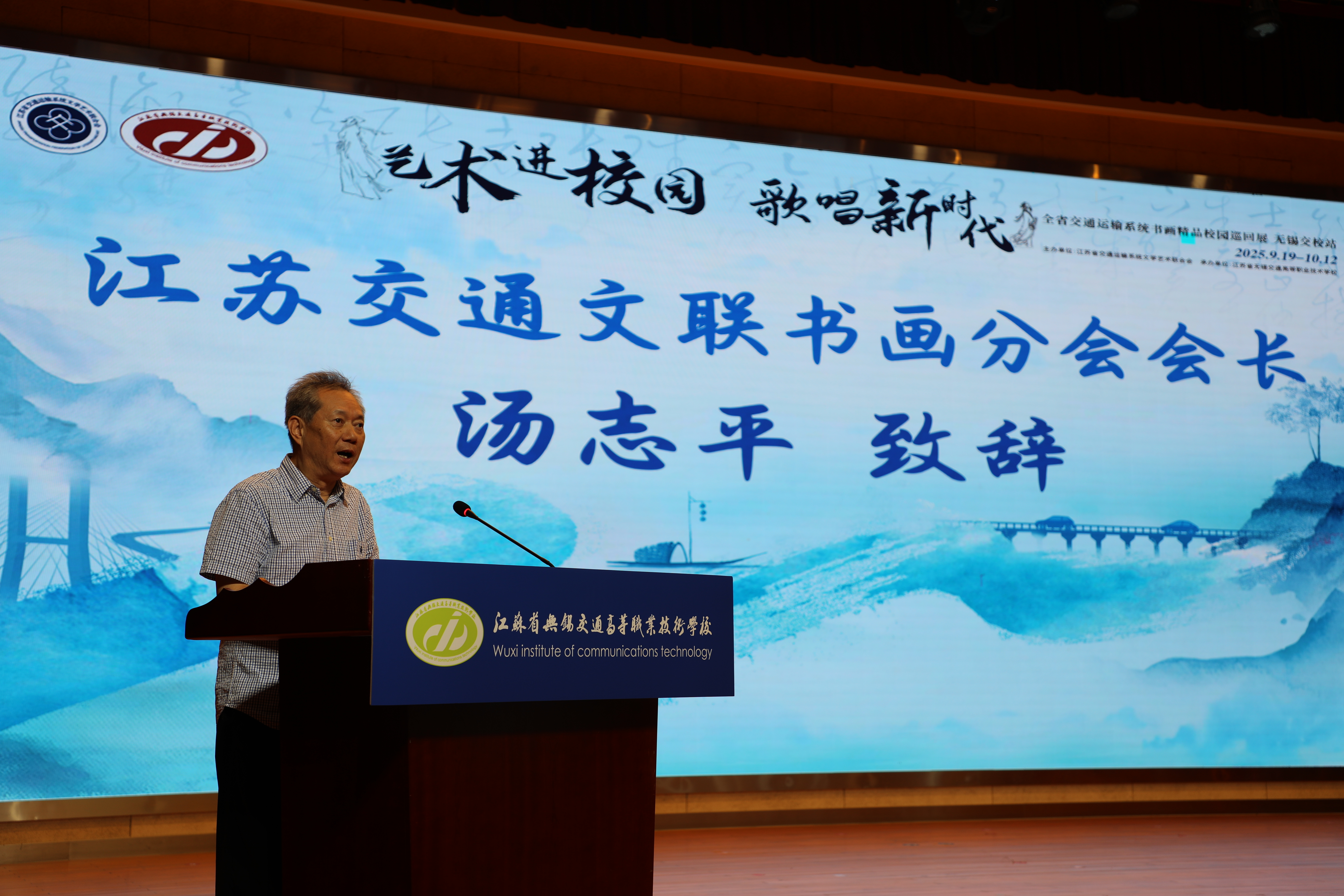 为深入学习习近平文化思想,推动文化育人与诗画艺术深度融合,9月19日上午,“艺术进校园·歌唱新时代”全省交通运输系统书画精品校园巡回展走进江苏省无锡交通高等职业技术学校。江苏省交通运输厅原党组成员、副厅长、江苏交通文联会长金凌,省交通运输厅原二级巡视员、机关党委书记,江苏交通文联副会长陈萍,省交通运输厅原二级巡视员、江苏交通文联副会长兼秘书长黄岩,江苏交通文联执行秘书长、作家分会会长陆新民,江苏交通文联书画分会会长汤志平,学校党委书记李进等领导出席活动。江苏交通文联相关负责同志、学校领导班子成员、各部门负责人以及师生代表参加活动并参观书画展?;疃裳P3す⑿嘶鞒?。