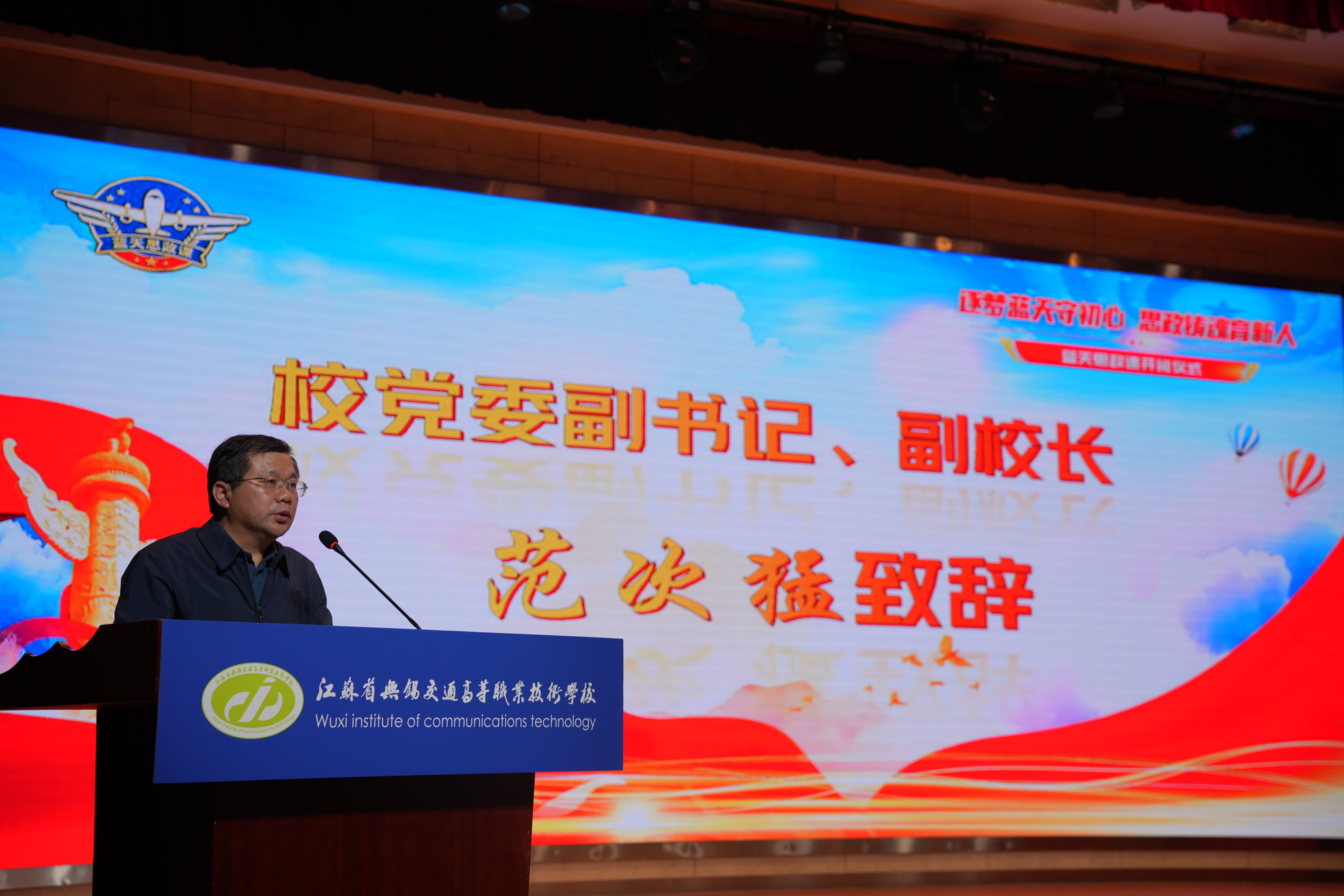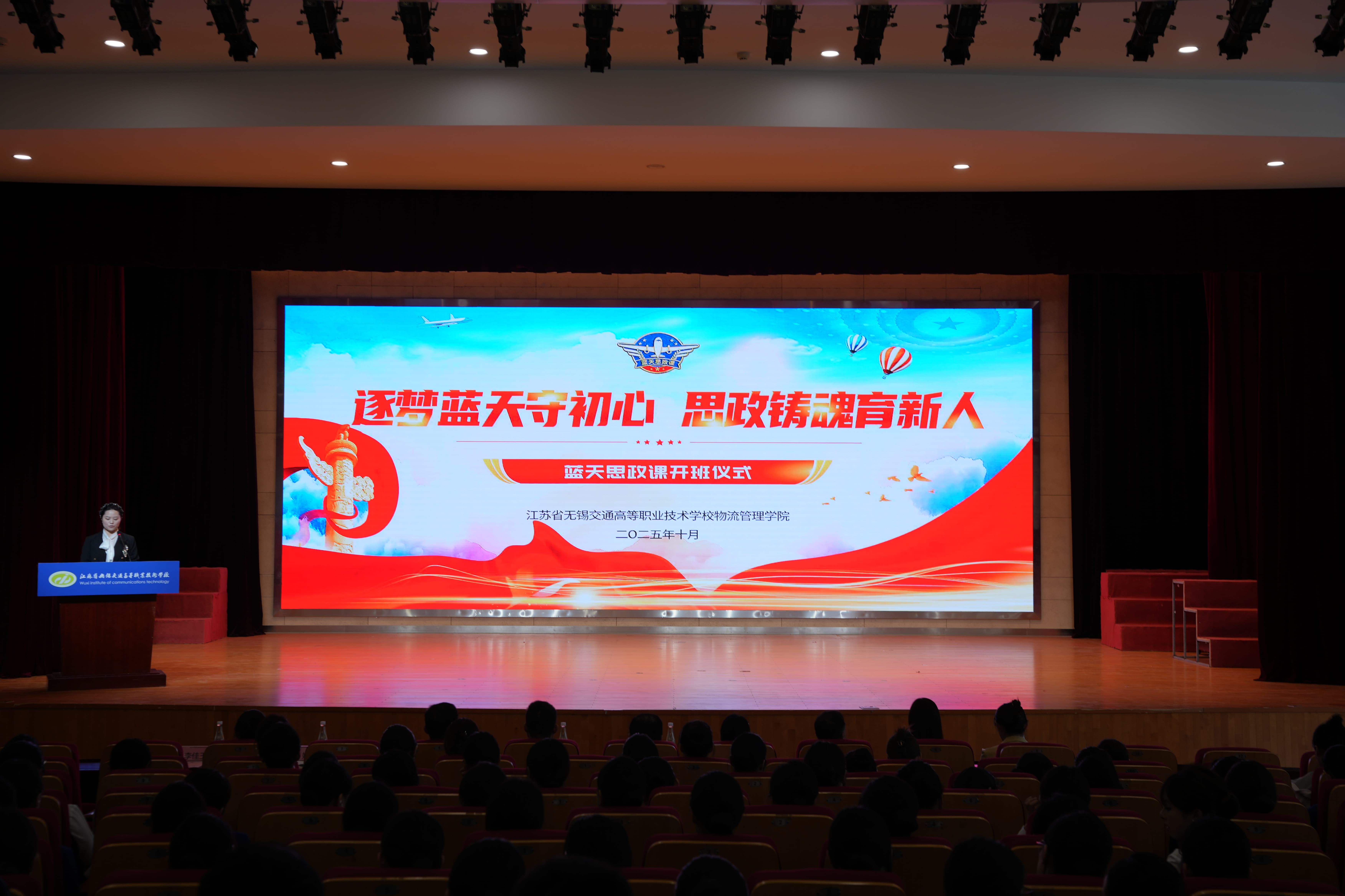 10月28日下午,学校物流管理学院“逐梦蓝天守初心 思政铸魂育新人”蓝天思政课开班仪式在学校礼堂隆重举行。校党委副书记、副校长范次猛,南京蓝天教育集团有限公司总经理朱正华莅临指导,江苏联院交通运输专指委副秘书长、学??蒲写ΥΤば夏厩澹锪鞴芾硌г喝宓匙苤奔?500 余名航空专业师生共同见证这一兼具行业特色与育人深度的育人盛事。