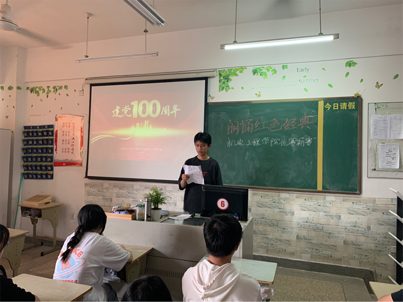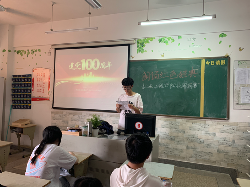 今年是中国共产党成立一百周年,学校为了激发师生的爱国情怀,绽放师生积极向上的精神风貌,在开展党史教育的同时,学校也组织了“诵读红色经典、学传百年历程”诵读大赛,机电工程学院积极组织学生参加诵读大赛。
