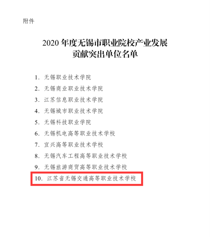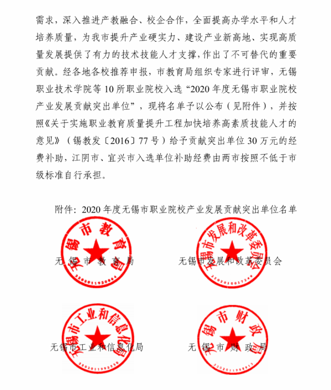 12月8日,无锡市教育局发布了《关于公布无锡市职业院校促进产业发展贡献突出单位名单的通知》(锡教发〔2020〕101号),我校获评2020年度无锡市职业院校促进产业发展贡献突出单位”,并获30万补助。