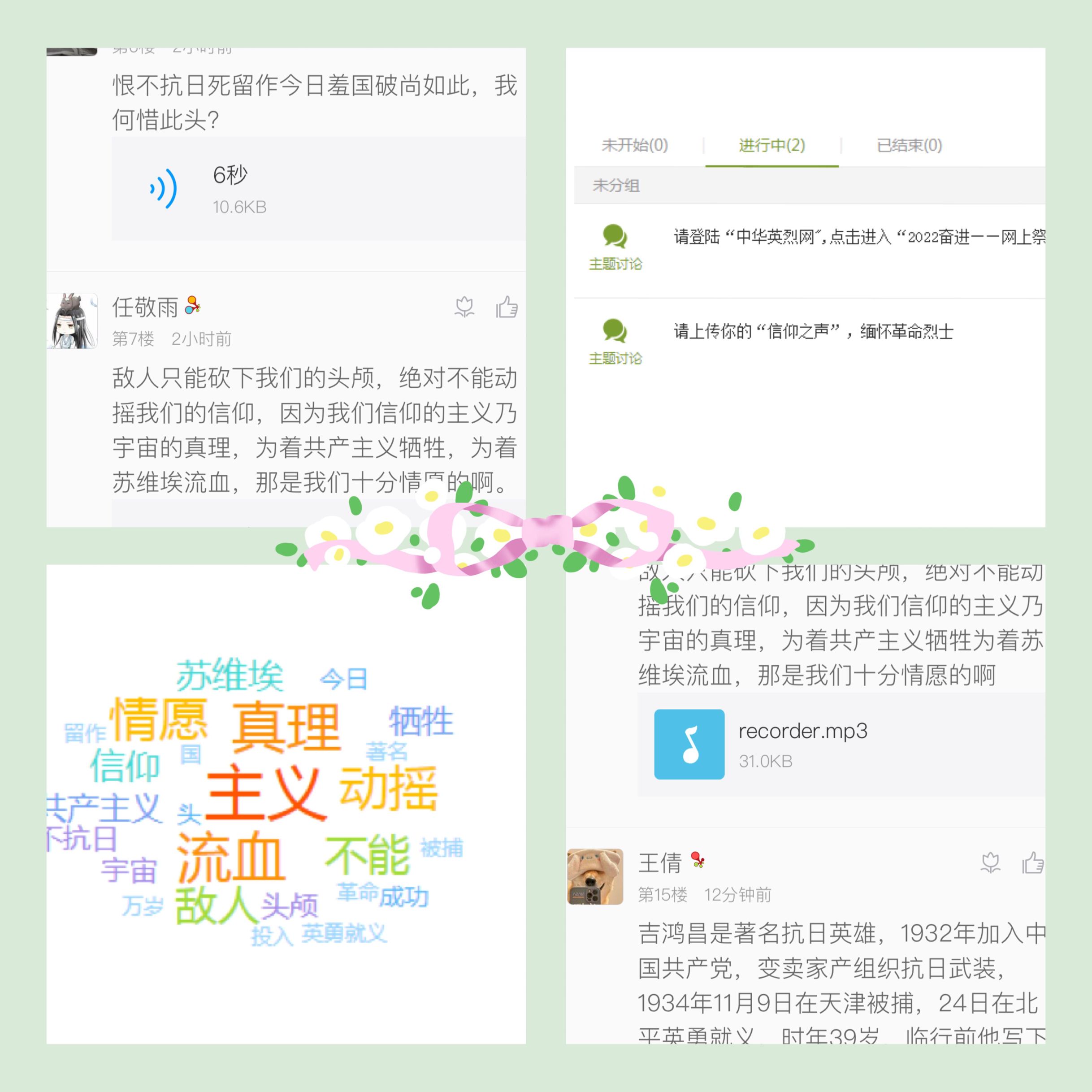 本次社团活动根据疫情防控要求,利用学习通平台进行线上活动?;疃?,茶艺社两位社团指导老师通过学习通直播平台,与同学们一起了解清明节的由来以及传统习俗,介绍了中国共产党在百年奋进史中涌现出的革命先烈以及先进事迹。为表达对革命先烈的缅怀之情,同学们纷纷录制了语音朗诵音频并上传至学习通。