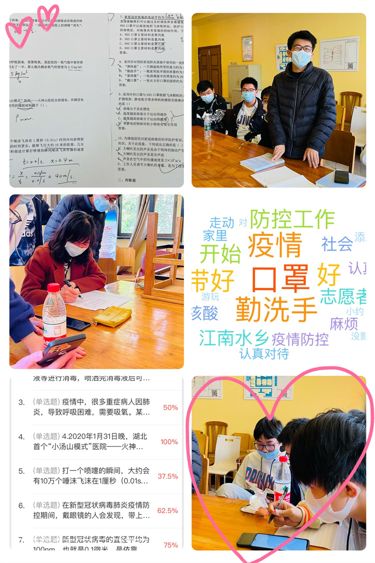 活动前,指导老师袁雪平老师广泛查阅资料,精心筛选疫情防控中与物理相关的案例,编辑成题目上传至学习通?;疃?,袁老师首先明确本次活动的目的和形式,随后学生现场加入班课,独立完成测试并提交。通过测试成绩进行排名,评选出一、二等奖,并颁发纪念品。随后,师生结合测试中涉及的部分疑难问题,如戴口罩的必要性、红外线测温原理、负压实验室的优点等再次进入深入探讨。最后,大家分享活动心得,并就“作为学生如何做好疫情防控工作”“疫情给我带来的影响”等问题展开讨论。