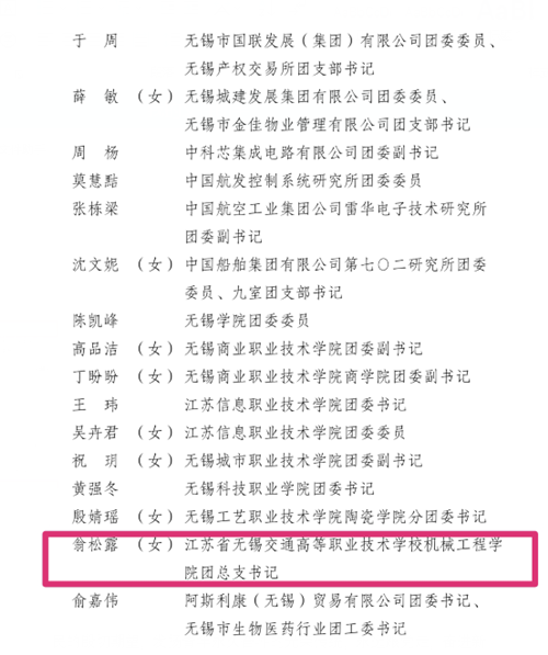 我校江苏省无锡交通高等职业技术学校信息管理学院团总支获评“无锡市五四红旗团支部(团总支)”,船舶工程学院181121(41)班李丹凤同学和信息管理学院181612班赵唯一同学获评“无锡市优秀共青团员”,机械工程学院团总支书记翁松露同志获评“无锡市优秀共青团干部”。