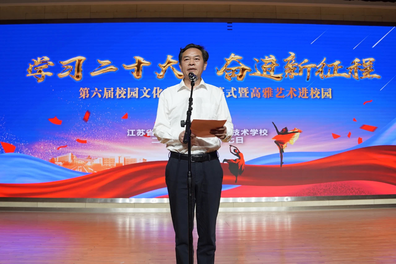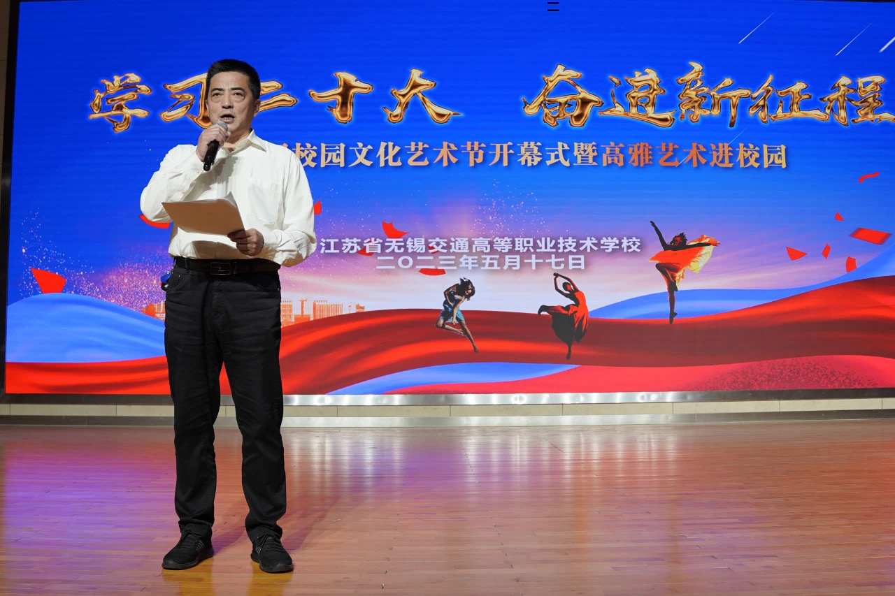 为进一步学习贯彻党的二十大精神,加强校园文化建设,营造积极健康、高雅文明的校园人文环境。5月17日,学校第六届校园文化艺术节开幕式暨高雅艺术进校园活动隆重举行。江苏省交通运输厅团委书记钱京江,校党委书记、校长李虎,校党委委员、副校长耿兴华、校纪委书记邢勇、副校长范次猛出席此次活动??皇接尚5澄?、副校长倪依纯主持。