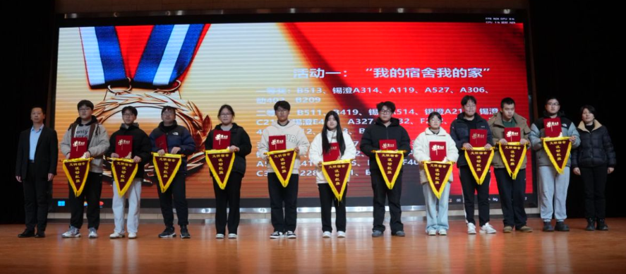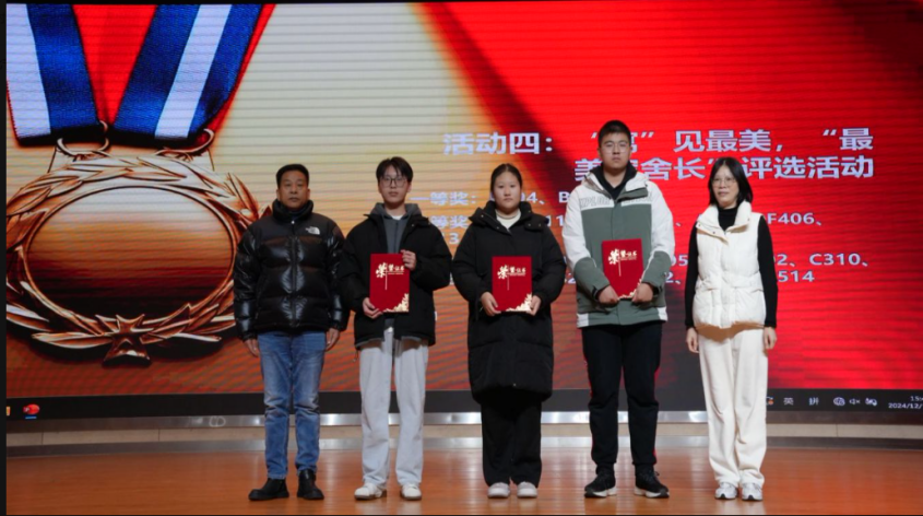 1211午,我校2024“宿舍文化节”评比颁奖仪式暨宿舍长培训讲座大礼堂举行。学生工作处副处长籍鑫慧,后勤管理处宿舍负责人,银城物业总经理,各学院学工领导参加颁奖仪式,并为获得奖项的寝室学生代表发奖状和奖品。