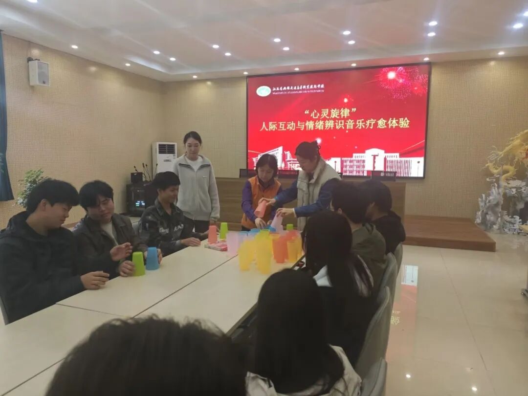 11月20日,学校邀请无锡市精神卫生中心谌利民主任和张一楠音乐治疗师团队,为同学们带来一场“心灵旋律”人际互动与情绪辨识疗愈体验活动。 活动伊始,张一楠老师通过播放轻柔的音乐,引导同学们深呼吸,放松身心。接着引导同学们在不同风格的音乐中画出自己的情绪体验。随着一曲悠扬的古典音乐缓缓响起,学生们纷纷拿起画笔,在画纸上勾勒出一幅幅宁静致远的画面,仿佛能透过音符感受到那份深邃与平和。紧接着,节奏明快、充满动感的流行音乐响起,学生们的画风也随之转变,画面上充满了活力与激情,色彩斑斓,动感十足?!氨哟蚧骼帧被方?,他们将手中的杯子变成了独特的乐器,演奏出了一段段富有节奏感的旋律。有的同学还加入了拍手、踏步等动作,使得整个表演更加生动有趣。 在此次活动中,同学们释放了学习压力,增强了团队协作精神和创新意识。同时,活动也为学校心理健康教育工作拓展了新思路和方法。