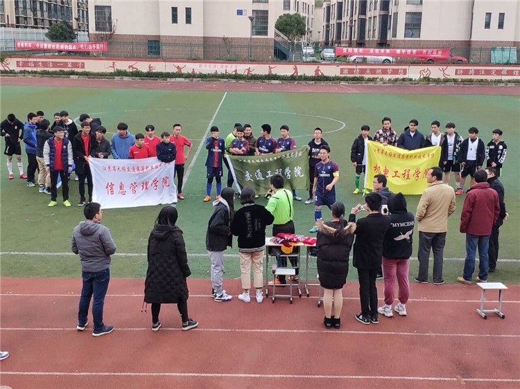 ??在2018年12月5日的校足球赛的冠亚军争夺赛中,卫冕冠军交通工程学院足球队表现出色,战胜了老对手机电工程学院足球队,实现了校足球联赛的四连冠。赛后的颁奖仪式中,学工处副处长熊睿老师、机电工程学院党支部书记徐小国老师共同为本次比赛冠军颁发了奖牌和奖杯。