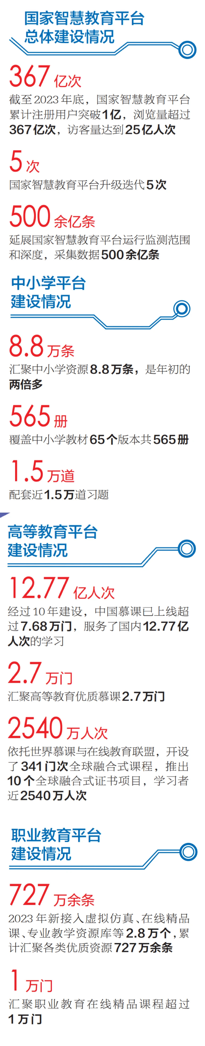 一组数据见证了我国教育数字化的蓬勃之势:建成世界第一大教育教学资源库,发布一系列教育数字化的标准规范,慕课建设和应用规模成为世界第一……截至2023年底,国家智慧教育平台累计注册用户突破1亿,浏览量超过367亿次,访客量达25亿人次,数字技术的叠加、倍增、溢出效应充分显现。