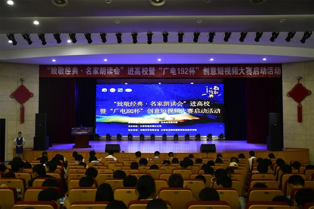 6月5日下午,一场别开生面的文化盛宴在学校大礼堂拉开帷幕。由江苏有线无锡分公司主办,无锡市学生联合会、江苏省无锡交通高等职业技术学校联合承办的“致敬经典·名家朗读会”进高校暨“广电192杯”创意短视频大赛启动活动在此成功举办。无锡市委宣传部出版印刷发行处副处长冯健,共青团无锡市委学少部副部长王裔,江苏有线无锡分公司党委委员、副总经理赵晓光,校党委委员、副校长耿兴华、王珏及在锡高校领导代表、江苏有线无锡分公司代表、我校师生代表600余人共同参加了本次活动。